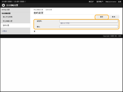 在[旧密码:]中输入当前密码,然后在[新密码:]或[确认:]中不输入任何值(保留为空)的情况下单击[确定]。如果[密码设置策略]中已配置输入字符限制,必须输入符合该设置的值。删除密码前请取消该限制。