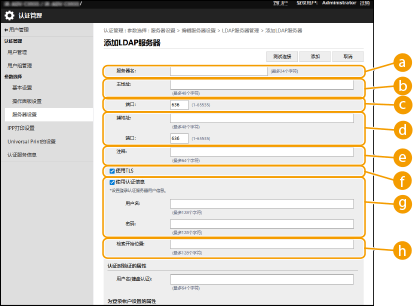 3 | 输入LDAP服务器信息。 ![]() [服务器名]输入LDAP服务器的名称。无法使用名称“localhost”。服务器名称不可以包含空格。 [主地址]输入LDAP服务器的IP地址或主机名(示例:ldap.example.com)。无法使用环回地址(127.0.0.1)。 [端口:]输入用于与LDAP服务器通信的端口号。使用与服务器上配置相同的设置。如果不输入编号,选择[使用TLS]复选框时会自动设为“636”,清除复选框时会自动设为“389”。 [辅地址:] / [端口:]在环境中使用辅助服务器时,输入IP地址和端口号。 [注释]必要时输入描述或说明。 [使用TLS]与LDAP服务器的通信使用TLS加密时选择此复选框。 [使用认证信息]仅在LDAP服务器设为允许匿名访问时,清除此复选框才可以匿名访问LDAP服务器。使用用户名和密码进行认证时,选择此复选框并输入[用户名:]和[密码:]的值。 [检索开始位置:]指定执行LDAP服务器认证时检索用户信息的位置(等级)。 |