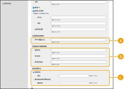 4 | 指定如何设置属性名称和域名。 ![]() [用户名(键盘认证):]为LDAP服务器上的用户名指定LDAP数据字段(属性名称)(示例:uid)。 [登录名称:] / [显示名称] / [电子邮件地址]为LDAP服务器上每个用户帐户的登录名称、显示名称和电子邮件地址指定LDAP数据字段(属性名称)(示例:uid、cn、mail)。 [指定域名] / [指定域名获取的属性名称]选择如何设置登录目标的域名。要直接指定域名,请选择[指定域名],然后输入域名。要指定从中获取LDAP服务器上域名的LDAP数据字段(属性名称),请选择[指定域名获取的属性名称],然后输入属性名称(示例:dc)。 |