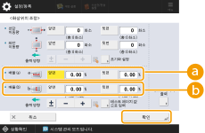 1 | <화상위치 조정> 화면에서 <배율 (a)> 및 <배율 (b)>에 대해 확대/축소 비율(%)을 설정하고  <OK>를 누릅니다. <배율 (a)>입력된 비율에 따라 이송 방향과 평행한 방향으로 이미지를 확대하거나 축소합니다. <배율 (b)>입력된 비율에 따라 이송 방향과 수직 방향으로 이미지를 확대하거나 축소합니다. 필요에 따라 테스트 페이지 용지를 다시 인쇄한 다음 보정 크기를 확인합니다. |
