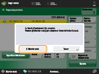 Consultar el nombre total de destinacions especificadesEl nombre total de destinacions especificades apareix a la part superior dreta de la pantalla. Això permet confirmar que el nombre de destinacions és correcte abans d'enviar. Cancel·lació immediata d'un treball que s'està enviantSi premeu  (Aturar) al tauler de control mentre s'envia un treball, es mostrarà el missatge <Voleu cancel·lar els següents treballs d'enviament?>. Premeu <Sí> per cancel·lar l'enviament. Premeu  (Aturar) si hi ha diversos treballs d'enviament per visualitzar la pantalla que permet seleccionar el treball que voleu cancel·lar. Si el treball d'enviament que voleu cancel·lar no hi apareix, premeu <Compr. altres treballs> per visualitzar <Enviar treballs>. Seleccioneu el treball que voleu cancel·lar i premeu <Cancel·lar>. Per comprovar els estats dels documents enviats/desatsSi <Mostrar avís en acceptar el treball> està establert en <On>, la pantalla <Monitor estat> pot aparèixer a partir de la pantalla següent mostrada després de rebre un treball d'enviament. <Mostrar avís en acceptar el treball>Per imprimir l'informe de resultats d'enviament/desamentA la pantalla de Funcions Bàsiques de Lectura, prement <Opcions>  <Informe de TX> podreu establir la impressió automàtica de l'informe que llista els resultats de l'enviament/desament. Per establir aquest paràmetre per a tots els treballs d'<Opcions>, cal seleccionar <Només si hi ha error> o <Off> a <Informe de TX> i, a continuació, establir <Permetre impressió des d'opcions> en <On>. Nom del fitxerQuan un fitxer s'envia/desa, el seu nom de fitxer es defineix automàticament amb el format següent. Podeu canviar l'opció de manera que es pugui assignar un nom diferent. Definició d'un nom de fitxerQuan envieu per correu electrònic Format "Números de treball (quatre dígits)_números de pàgina (tres dígits).nom extensió fitxer", com ara "1042_001.jpg" Quan deseu en un servidor de fitxers "L'any, mes, dia, hora, minut i segon en què s'hagi desat el fitxer (14 dígits).nom extensió fitxer", com ara "20151030133541.jpg" Assumpte del correu electrònicDetectar alim. diversos fulls Detectar alim. diversos fulls Si s'introdueixen diversos fullsLa lectura s'interromp i el missatge apareix a la pantalla. Seguiu les instruccions per eliminar l'encallament. Quan l'hàgiu solucionat, es mostrarà la pantalla per reprendre el treball. Si l'equip detecta per error diversos fulls a l'alimentador, premeu <No detectar alimentació de diversos fulls> per reprendre la lectura. Si voleu que l'equip no us notifiqui de l'entrada de diversos fulls a l'alimentador, realitzeu una de les operacions següents. Cada vegada que envieu o deseu un document, premeu <Opcions> a la pantalla de funcions bàsiques de lectura  seleccioneu <Detectar alim. diversos fulls> per desactivar l'opció. |