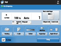 Tryk på , der vises på <Hjem>-skærmen, og skærmen Grundlæggende funktioner, for at tilpasse skærmbilledet, som f.eks. omarrangement af knapper eller oprettelse af en genvejsknap. Tilpasning af touchpanelet![]() Du kan ændre indstillinger uanset skærmvisningen, som f.eks. hvilket skærmbillede der vises umiddelbart efter maskinen tændes, og om meddelelsen om resterende papir og toner skal vises. <Visningsindstillinger> Du kan indstille skærmbilledet til at blive vist, når der er gået en vis periode uden betjening. <Funktion efter auto-nulstilling> |