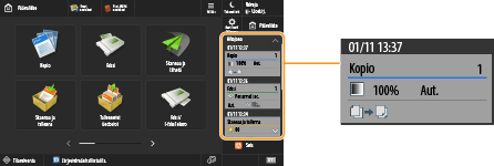 Aikajana on kätevä käyttäjille, jotka haluavat toistuvasti käyttää samoja asetuksia ja vastaanottajia esimerkiksi toiminnoille "Kopio" ja "Skannaa ja lähetä". Käytettyjen asetusten historia lisätään automaattisesti aikajanaan ja samat asetukset voi hakea painamalla niitä.