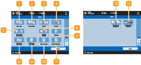 Apresenta o estado das programações como o formato do papel onde pretende imprimir e o número de impressões. Não se esqueça de confirmar as programações para uma impressão correta. Para alterar as programações, carregue no botão sob a secção de apresentação. Para alterar o número de impressões, introduza o número pretendido utilizando as teclas numéricas.