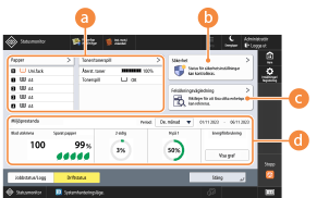 En skärm visas som låter dig kontrollera statusen för flera objekt samtidigt såsom återstående mängd papper och toner, status gällande maskinens säkerhetsåtgärder, supportinformation vid felsökning av problem som uppstår under fax och utskrift samt utskriftsjobbets status och strömförbrukning inom en angiven tidsperiod.