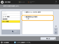 二要素認証でログインする場合は以下の設定を行ってください。 <モバイル認証>と<キーボード認証>を<OFF>にする。 <設定メニューのボタン表示>の<ICカードの登録>、<ICカードの削除>、<ICカードの暗証番号の変更>を<OFF>にする。 リモートUIやデバイス管理ソフトウェアなどのネットワークからのアクセスは二要素認証でのログインに対応していません。 |