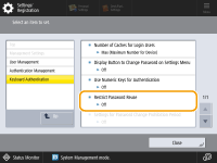 <Restrict Password Reuse> | <On>, <Off> When <On> is set: <Number of Prohibited Last Passwords>: 1 to 24 | No | No | Yes | No | C | Settings/Registration Basic Information |
