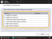Press  (Settings/Registration)  <Adjustment/Maintenance>  <Adjust Image Quality>  <Color Calibration for Each Paper Type>.