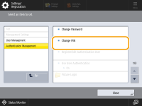 <Change PIN> | (7 characters maximum) | Yes | Yes | Yes | No | C | Authentication User Management |