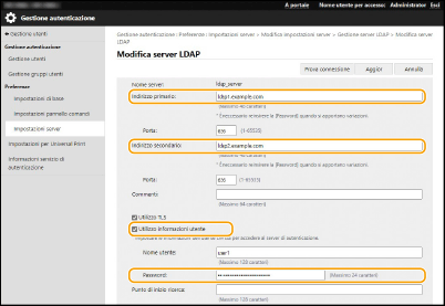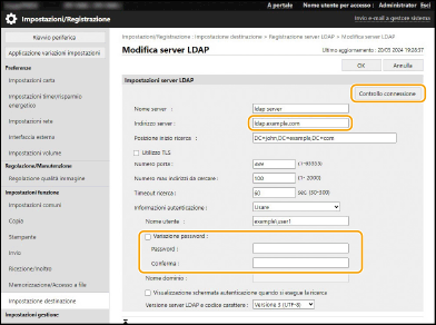 Se sono specificate le informazioni di autenticazione, è necessario immettere nuovamente la password quando si modifica [Indirizzo server] in [Impostazioni server LDAP] e si registra, o quando si cambia [Indirizzo server] e si preme [Controllo connessione].