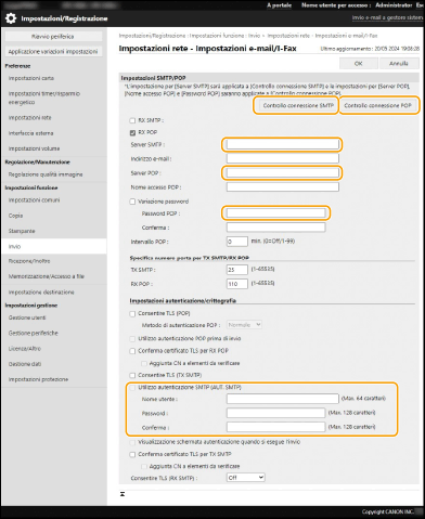 Se è impostato [Password] per [Utilizzo autenticazione SMTP (AUT. SMTP)], è necessario immettere nuovamente la [Password] quando si modifica e si registra l'indirizzo [Server SMTP], o quando si cambia l'indirizzo del server e si preme [Controllo connessione SMTP].