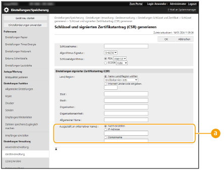 Bei der Erzeugung eines Schlüssels und einer CSR können Sie jetzt [Ausgestellt an (Alternativer Name)] festlegen.