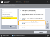 <Passwortwiederverwendung beschränken> | <Ein>, <Aus> Bei Einstellung von <Ein>: <Anzahl der letzten untersagten Passwörter>: 1 bis 24 | Nein | Nein | Ja | Nein | C | Grundinformationen Einstellungen/Speicherung |