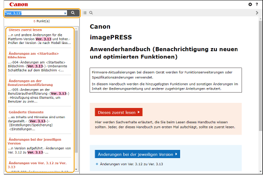 Suche auf ListenseiteSuche nach SchlüsselwortBei einer Suche durch Eingabe der Version als Schlüsselwort (beispielsweise "Ver. 3.13") erscheint eine Liste mit Seiten, die dieses Schlüsselwort enthalten. Sie können dann die aufgelisteten Seiten durchsuchen. |