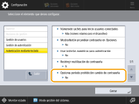 <Opciones período prohibición cambio de contraseña> | <Sí>, <No> Si se selecciona <Sí>: <Período de prohibición>: de 1 a 179 | No | No | Sí | No | C | Información básica de configuración |