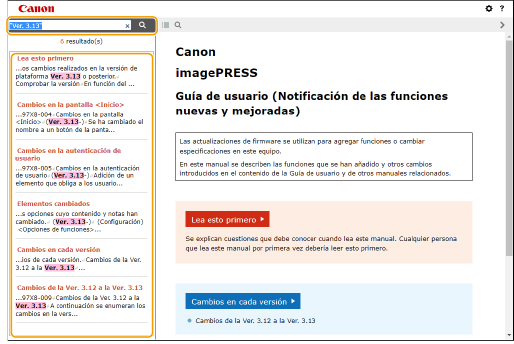 Buscar página de listaLe permite buscar páginas donde se enumeran en una lista todos los cambios de cada versión. Cambios en cada versión. Buscar por palabra claveSi se busca con la versión como palabra clave (por ejemplo, "Ver. 3.13"), se muestra una lista de páginas que incluyen esa palabra clave. A continuación, puede buscar entre las páginas de la lista. |