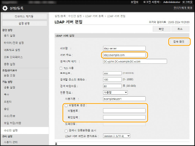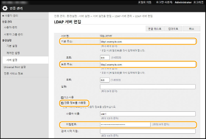인증 정보를 지정한 경우, [LDAP 서버 설정]에서 [서버주소]를 변경하여 등록하거나, [서버주소]를 변경하고 [접속 확인]을 누를 때 비밀번호를 다시 입력해야 합니다.