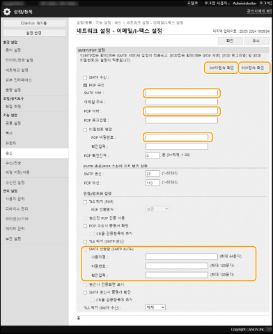 [SMTP 인증함 (SMTP AUTH)]에 [비밀번호]를 설정한 경우, [SMTP 서버] 주소를 변경하여 등록하거나 서버 주소를 변경하고 [SMTP접속 확인]을 누를 때 [비밀번호]를 다시 입력해야 합니다.