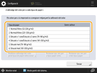 L'accessori opcional [Espectrofotòmetre en línia-A] és necessari per dur a terme la calibració del color per a cada tipus de paper. Quan realitzeu el calibratge per a cada tipus de paper, les opcions de gradació s'ajustaran automàticament a les opcions predefinides per al tipus de paper en qüestió. Amb aquesta funció, es millora l'estabilitat de la gradació. Si la gradació o el color després del calibratge per a cada tipus de paper no és satisfactori, realitzeu ajustos addicionals; per exemple, ajusteu el <Balanç de color> des d'<Ajust/Manteniment> <Ajustar qualitat d'imatge>. |