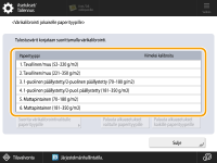Paperityyppikohtaiseen värikalibrointiin tarvitaan valinnainen [In-line-spektrofotometri-A]. Kun teet värikalibroinnin paperityyppikohtaisesti, sävyasetukset säätyvät automaattisesti kyseiselle paperityypille määritettyjen asetusten mukaisiksi. Tämä toiminto parantaa sävytyksen vakautta. Jos sävytyksen tai värin laatu ei ole riittävä paperityyppikohtaisen kalibroinnin jälkeen, tee lisäsäätöjä: säädä esimerkiksi <Väritasapaino> kohdasta <Säätö/Ylläpito> <Säädä kuvan laatu>. |