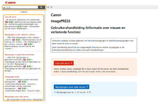 ZoeklijstpaginaZoeken op trefwoordZoeken door de versie als trefwoord in te voeren (bijv. "Ver. 3.13") geeft een lijst van pagina's weer die dat trefwoord bevatten. U kunt vervolgens zoeken door de aangegeven pagina's. |