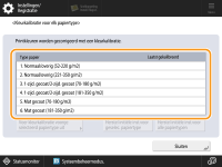 U kunt de volgende typen papier gebruiken. Zorg ervoor dat er papier van de volgende formaten in een papierbron is geplaatst voordat u aan de slag gaat. Papierformaat: A3, 11" x 17", 320 x 450 mm (SRA3), 12" x 18", of 13" x 19" Afwerking en basisgewicht: Normaal 1 tot 3, Dik 1 tot 6, 1-zijdig gecoat dun 3 tot 6, 2-zijdig gecoat dun 3 tot 6, Mat gecoat dun 3 tot 6 Er zijn zes papiertypen beschikbaar. Gebruik papier waarop u wilt afdrukken en voer een kalibratie uit voor elk papiertype. -1 Normaal/Overige (52 tot 220 g/m2), 2 Normaal/Overige (221 tot 350 g/m2), 3 1-zijdig gecoat/2-zijdig gecoat (70 tot 180 g/m2), 4 1-zijdig gecoat/2-zijdig gecoat (181 tot 350 g/m2), 5 Mat gecoat (70 tot 180 g/m2), 6 Mat gecoat (181 tot 350g/m2) Druk af op het papier waarmee u de kalibratie hebt uitgevoerd. Als u op een ander type papier afdrukt, worden de gekalibreerde gradatie-instellingen mogelijk niet correct op het afgedrukte papier toegepast. Deze functie is niet beschikbaar als de imagePRESS Server is bevestigd. Deze functie is niet beschikbaar als de optionele [In-line Spectrofotometer-A] niet aanwezig is. |