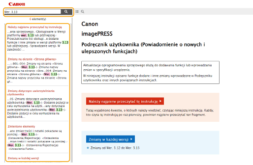 Strona przeszukiwania listyWyszukiwanie według słów kluczowychWyszukiwanie poprzez wpisanie wersji jako słowa kluczowego (np. „Wer. 3.13”) powoduje wyświetlenie listy stron, które zawierają to słowo kluczowe. Następnie możesz przeszukiwać wyświetlone strony. |