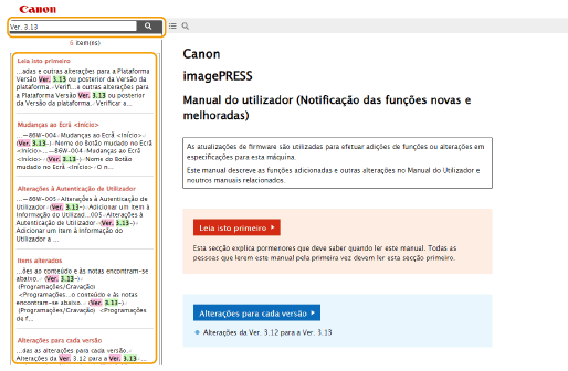 Página das listas de procuraProcurar por palavra-chaveProcurar com introdução da versão como palavra-chave (ex. “ver. 3.13”) apresenta uma lista de páginas que incluam essa palavra-chave. Pode, depois, procurar nas páginas listadas. |