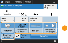 Регистриране в <Предпочитани настройки>В <Предпочитани настройки> можете да регистрирате често използвани процедури за копиране, както и често задавани дестинации и настройки за сканиране. За повече информация вижте Регистриране на комбинация от често използвани функции.