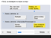 Изберете времето за показване на екрана за влизане. Ако изберете <Извежд., ког. е избр. функц.>, натиснете <Функции> и <Цветно копир./Печат>, изберете функцията, за която да се показва екранът за влизане, и натиснете <OK>. Също така изберете елементите за настройка на екрана <Настройки/Регистриране>, за който да се показва екранът за влизане.
