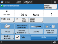 Na zaslonu <Početni prikaz> pritisnite funkcijske gumbe kako bi se prikazao zaslon s osnovnim značajkama na kojem možete pristupiti osnovnim funkcijama kao što su kopiranje, faksiranje i skeniranje. Iako se način prikaza i stavke postavki na zaslonu s osnovnim značajkama razlikuju ovisno o funkcijama, postavke možete promijeniti kako bi odgovarale vašim potrebama. Prilagođavanje zaslona s osnovnim značajkama