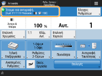 Εμφανίζει την κατάσταση των ρυθμίσεων, όπως την κλίμακα αντιγραφής, το μέγεθος χαρτιού και τον αριθμό αντιγράφων. Βεβαιωθείτε ότι έχετε ελέγξει τις ρυθμίσεις ώστε να εκτελέσετε σωστά την αντιγραφή. Για να αλλάξετε τις ρυθμίσεις, πατήστε το κουμπί κάτω από το τμήμα της οθόνης.