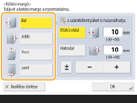 Kötésmargókat is elhelyezhet a másolaton tűzéshez vagy lyukasztáshoz. Külön is beállíthatja az elülső oldal és a hátoldal kötésmargóit.