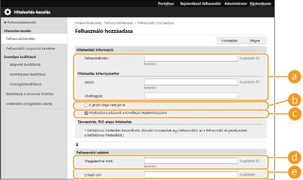 (Beáll./Bejegyzés) <Felügyeleti beállítások> <Felhasználókezelés> <Hitelesítés-kezelés> <Hitelesítési felhasználó bejegyzés/szerkesztés> lehetőség kiválasztásával is bejegyezheti. <Hitelesítési felhasználó bejegyzés/szerkesztés>Felhasználói csoportok létrehozásaA Címjegyzékben lévő Címlistákat az egy felhasználói csoportba bejegyzett felhasználók között meg lehet osztani. Felhasználói csoportok bejegyzése