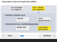 Nyomja meg a <Be> gombot a következőhöz: <Felhasználói hitelesítés használata>, nyomja meg a <Be> gombot a bejelentkezési mód használatához, majd nyomja meg a <Következő> gombot.