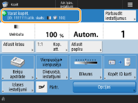 Tiek parādīts iestatījumu statuss, tostarp kopēšanas koeficients, papīra formāts un kopiju skaits. Pārbaudiet iestatījumus, lai kopēšana tiktu veikta pienācīgi. Lai mainītu iestatījumus, nospiediet pogu zem ekrāna daļas.