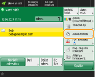 <Oriģ. satura orientācija> atlasiet <Tālās malas augšpuse> vai <Sānmalas augšpuse> atkarībā no oriģināla orientācijas nospiediet <OK>.Vairāku adresātu, tostarp faksu, norādīšanaIestatot <Iespējot faksu skenēšanas un sūtīšanas funkcijā> kā <Iesl.>, varat norādīt faksa adresātus skenēšanas pamatfunkciju ekrānā (<Rādīt faksa funkciju>). Šis iestatījums ir noderīgs, lai norādītu vairākus saņēmējus, tostarp faksus, piemēram, saglabājot nosūtīta faksa kopiju faila serverī.