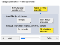 Pasirinkite prisijungimo ekrano rodymo laiką. Jei pasirinkote <Rodyti, kai fnkc. pasirinkta>, paspauskite <Funkcijos> ir <Spalv. kopija/atspaudas>, pasirinkite funkciją, kurios prisijungimo ekranas bus rodomas, ir paspauskite <Gerai>. Be to, ekrane <Parametrai/įregistravimas> pasirinkite parametro elementus, kad būtų rodomas prisijungimo ekranas.