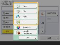 Det er praktisk å registrere en ofte brukt destinasjon i en ettrykksknapp. Dette lar deg raskt spesifisere en destinasjon med ett enkelt trykk på en knapp. I tillegg til å registrere et faksnummer eller en e-postadresse i en ettrykksknapp, kan du også registrere en filservermappeplass (IP-adresse og bane) som skal brukes når du lagrer skannede data.