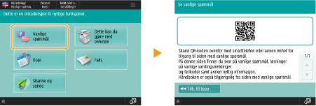 Vis funksjonsveiledningen og Vanlige spørsmål-sidenTrykk på <Veiledning/Vanlige spørsm.> for å vise et skjermbilde som introduserer deg til hva du kan gjøre med funksjonene på maskinen samt tips for å bruke kopiering, skanning osv. Vis dette skjermbildet når du vil finne ut mer om hvilke funksjoner som er tilgjengelig, og hvordan du bruker dem. Du kan også åpne Vanlige spørsmål-siden på en mobilenhet.