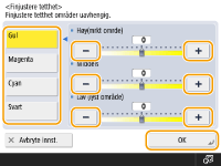 Du kan lagre opptil fire innstillinger etter justering. Etter å ha justert fargen, trykker du på <Hente/lagre>