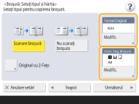 Apăsaţi <Modificare> din <Format Original> şi selectaţi dimensiunea documentului original. Dacă selectaţi <Auto>, dimensiunea de broşură este selectată automat în conformitate cu dimensiunea documentului original.
