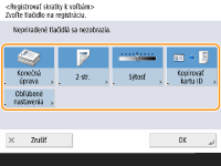V časti <Obľúbené nastavenia> môžete uložiť často používané postupy kopírovania, ako aj často špecifikované miesta určenia a nastavenia skenovania. Bližšie informácie nájdete v časti Uloženie kombinácie často používaných funkcií.