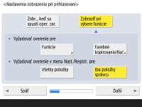Vyberte, kedy sa má zobraziť prihlasovacia obrazovka. Ak vyberiete možnosť <Zobraziť pri výbere funkcie>, stlačte tlačidlo <Funkcie> a <Farebné kopírovanie/tlač>, vyberte funkciu, ku ktorej chcete zobrazovať prihlasovaciu obrazovku, a stlačte tlačidlo <OK>. Takisto aj na obrazovke <Nastavenia/Registrácia> vyberte položky, ku ktorým chcete zobrazovať prihlasovaciu obrazovku.