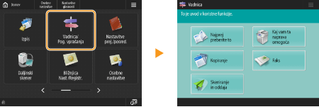 Ogled priročnika s funkcijami in strani s pogostimi vprašanjiPritisnite <Vadnica/Pog. vprašanja>, če želite prikazati zaslon, na katerem je predstavljeno, kaj lahko počnete s funkcijami naprave in tudi nasveti za kopiranje, optično branje in drugo. Na tem zaslonu lahko izveste več o razpoložljivih funkcijah in načinih njihove uporabe. Do strani s pogostimi vprašanji lahko dostopate tudi iz mobilne naprave.