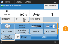 Gumbe za nastavitve, ki so prikazani na zaslonih z osnovnimi funkcijami (za kopiranje, pošiljanje faksov in optično branje), je mogoče spremeniti z drugimi gumbi za nastavitve v <Opcije>. S pogosto uporabljenimi gumbi za nastavitve na zaslonu z osnovnimi funkcijami lahko učinkoviteje uporabljate funkcije. Poleg tega lahko prikažete različen zaslon z osnovnimi funkcijami, prilagojen za posameznega uporabnika.