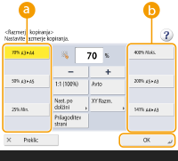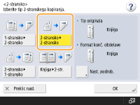 Ko je prikazan zaslon za izbiro velikosti izvirnikaČe je za <Izbira papirja> izbrano <Avto>, se bo morda prikazal zaslon za izbiro velikosti izvirnika. Ta se prikaže, ker velikosti izvirnika ni mogoče preveriti in papirja ni mogoče samodejno izbrati, če so naloženi zelo prosojni izvirniki, izvirniki z zelo temno osnovno barvo ali majhni izvirniki. Izbere velikost izvirnika ali velikost, ki je blizu izvirniku.