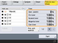 Preostalo količino potrošnega materiala lahko preverite v vmesniku Remote UI (Oddaljeni uporabniški vmesnik). Preverjanje statusa stroja