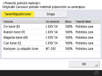 Tudi če je v <Preostali dnevi> prikazano <Potrebna zam.>, ne opravite zamenjave, dokler se na območju prikaza stanja (na dnu zaslona na dotik) ne prikaže sporočilo, ki vas poziva k zamenjavi potrošnega materiala.