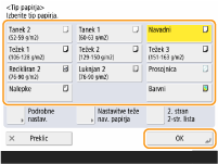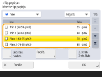 Ovojnice kot vrste papirja ni mogoče izbrati na zaslonu s podrobnostmi možnosti <Tip papirja>. Če želite kot vrsto papirja izbrati ovojnico, vrsto papirja registrirajte v <Registr. priljubljenega papirja (Večnam. podstavek)>, nato v 2. koraku pritisnite <Priljubljeni papir>